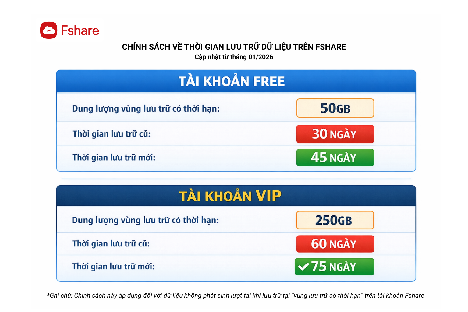 Nhằm nâng cao trải nghiệm dịch vụ tối đa quyền lợi cho người dùng có nhu cầu lưu trữ dữ liệu lớn, từ tháng 01/2026 Fshare chính thức cập nhật chính sách mới về thời gian lưu trữ dữ liệu.Theo đó, Fshare mở rộng thêm 15 ngày lưu trữ đảm bảo (không xóa dữ liệu) cho dữ liệu lưu tại “vùng lưu trữ có thời hạn” và không phát sinh lượt tải về. Chính sách này áp dụng đối với khách hàng sử dụng tài khoản miễn phí (Free member) và tài khoản VIP (Gói VIP).