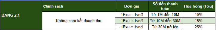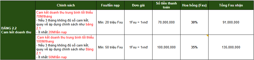 Với chính sách không cam kết doanh thu, bạn sẽ nhận được mức hoa hồng dao động từ 10% đến 25%. Tuy nhiên, nếu bạn tham gia chính sách Cam kết số, bạn sẽ có cơ hội nhận được hoa hồng cao nhất lên đến 35% – một mức hoa hồng hấp dẫn đặc biệt chỉ dành riêng cho Đại lý.