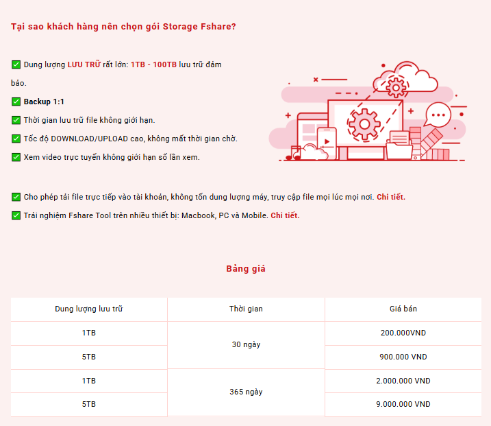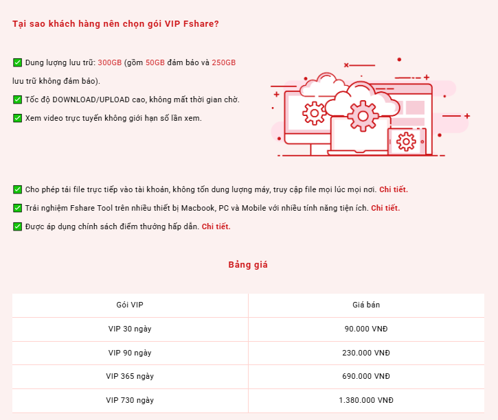 Để đáp ứng nhu cầu lớn hơn như lưu trữ video, kho tài liệu, hay chia sẻ dung lượng lớn, Fshare cung cấp đa dạng các gói dịch vụ: Gói VIP, Gói Storage, Gói traffic chia sẻ file tốc độ cao Hotfile/Directlink, Gói dung lượng tải… với nhiều ưu đãi hấp dẫn cho khách hàng.