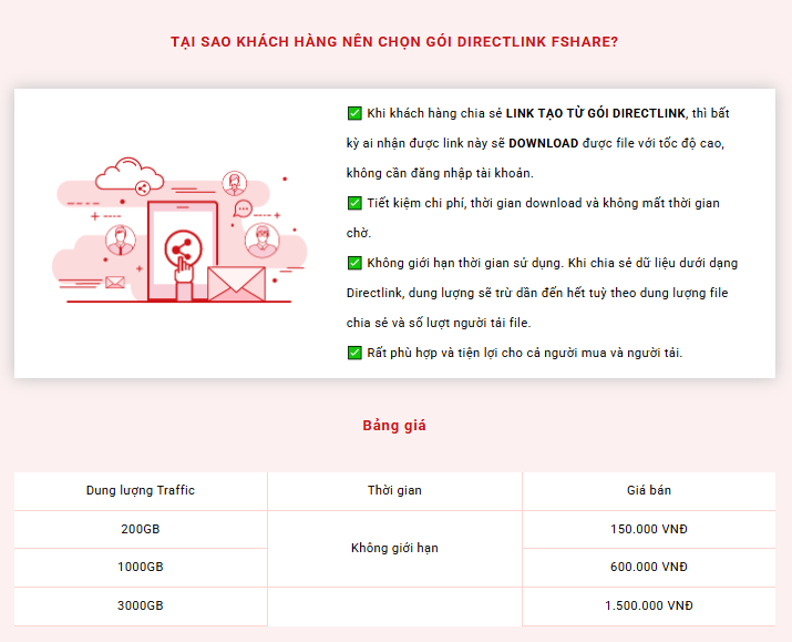 Dành cho người chia sẻ nhiều như photographer, thiết kế, nhà sáng tạo phát hành nội dung, tổ chức có nhu cầu chia sẻ file lớn…người nhận link được chia sẻ đã được cài đặt thành Hotfile/Directlink có thể tải file tốc độ cao mà không cần đăng ký/đăng nhập tài khoản Fshare.
