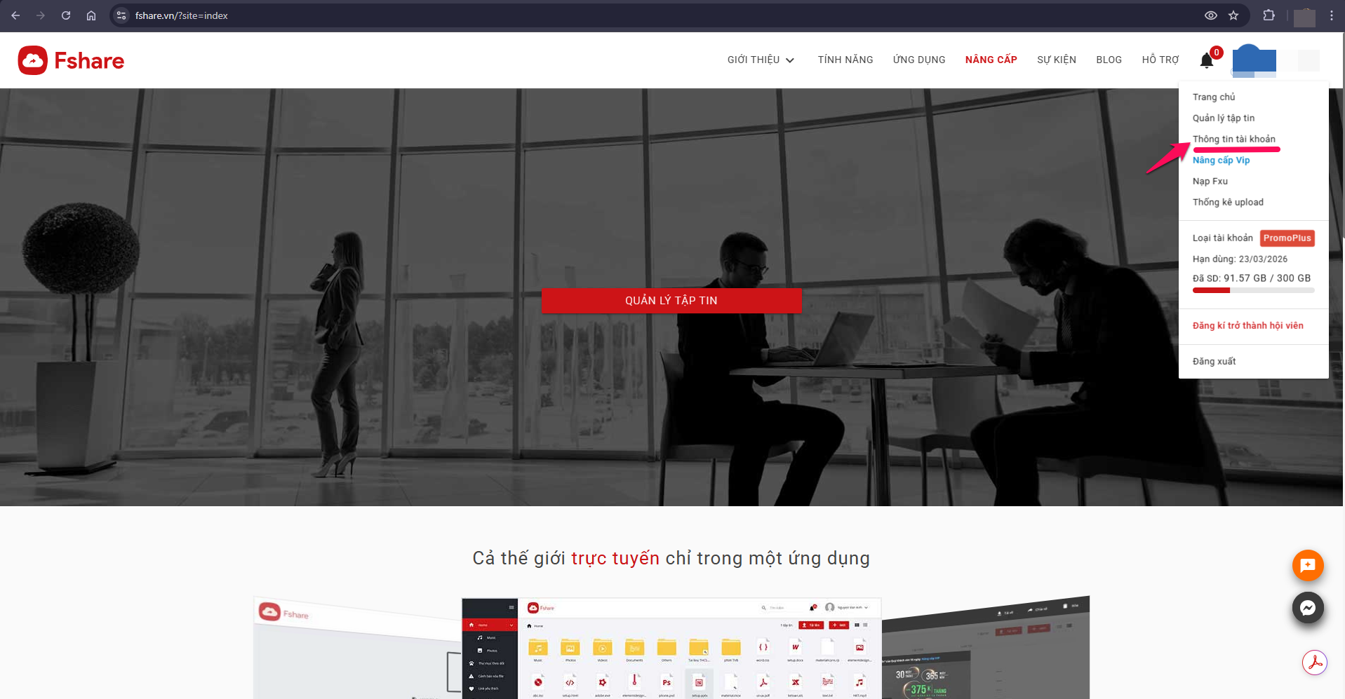 Bước 1: Truy cập vào Website https://www.fshare.vn/ thực hiện “Đăng nhập” tài khoản.