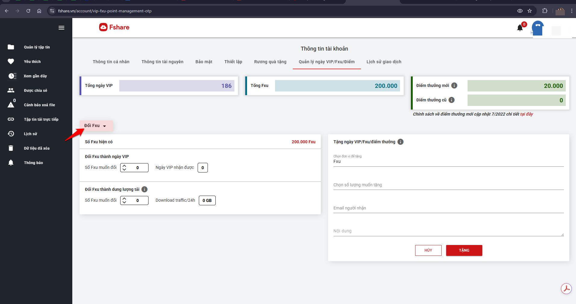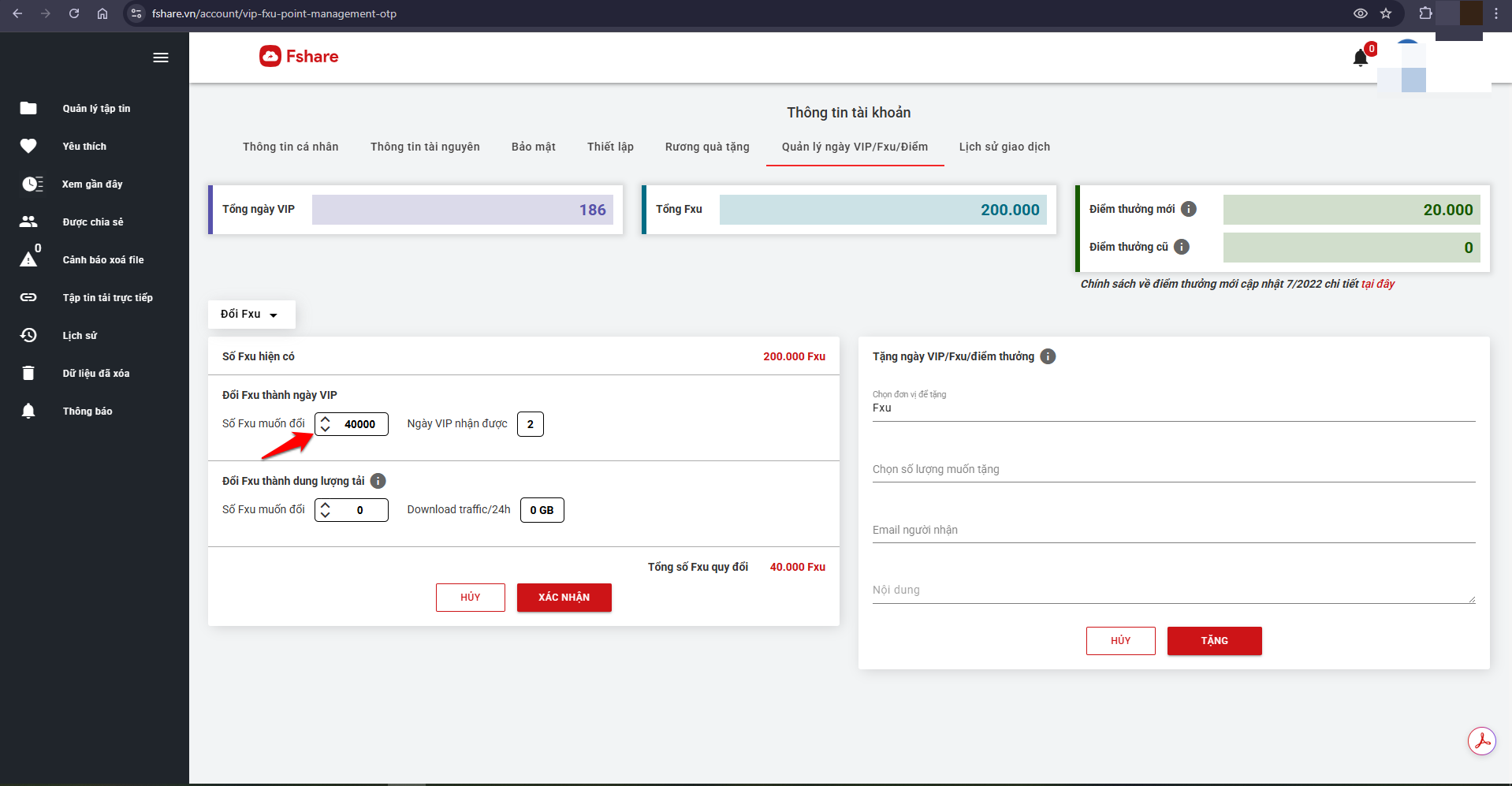 - Ví dụ: khách hàng chọn mua ngày VIP bằng Fxu, tại mục đổi Fxu thành ngày VIP, chọn số Fxu muốn đổi, hệ thống sẽ tự tính số ngày VIP nhận được như hình dưới đây: